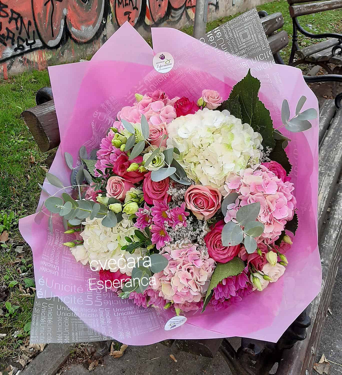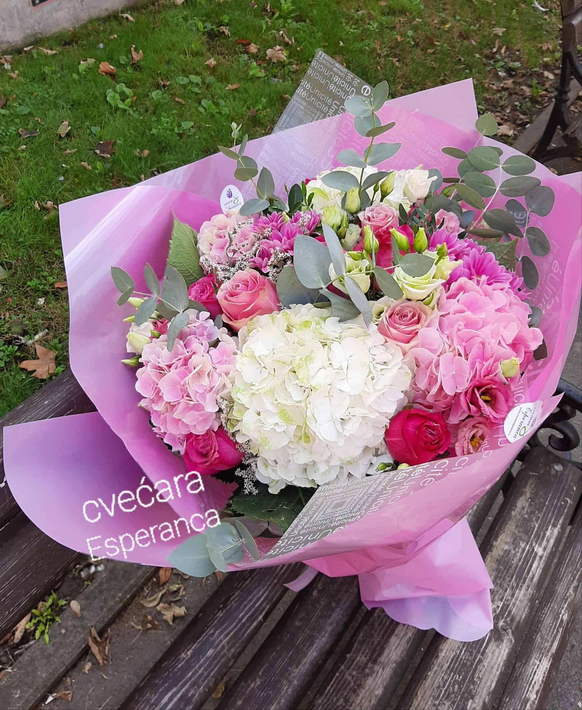 Sastavljen je od hortenzija, ruža, lizijantusa, hrizantema, eukaliptusa, dekorativnog zelenila.