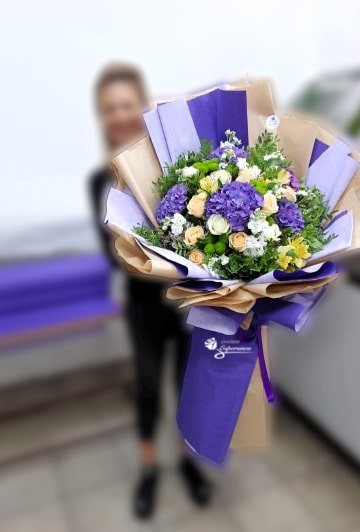 Buket sadrži hortenzije, ruže, matiolu, hrizantemu, alstromeriju, dekorativno zelenilo. Boje cveća i dekorativnog papira mogu biti po želji.