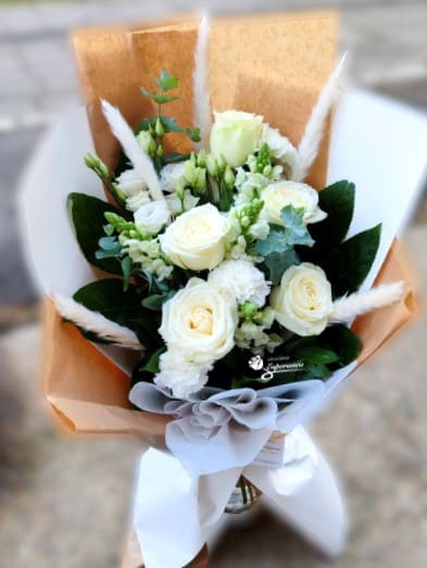 Buket ruža i lizijantusa u dekorativnom papiru.
