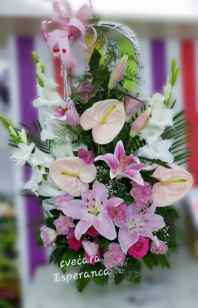 Cvetni aranžman – korpa sa cvećem – orjentalni ljiljan, anturium, gladiola, lizijantus – u sezoni