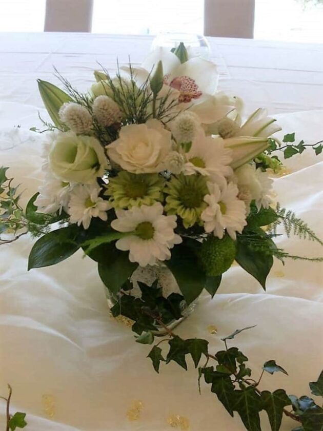 Dekoracija venčanja – cvetni aranžman u staklenoj vazi.