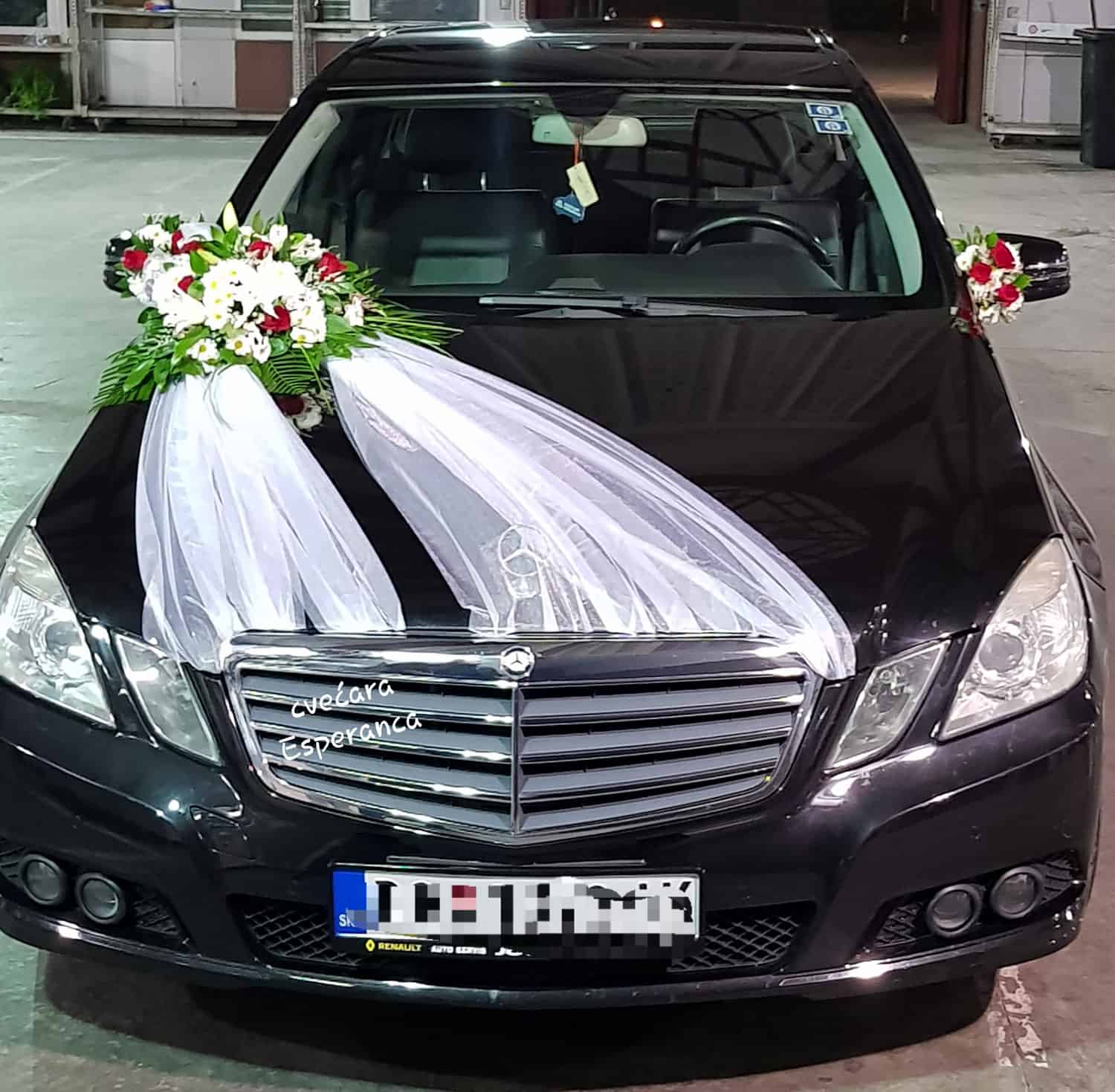 Dekoracija mladenačkih kola sa tri buketa i tilom