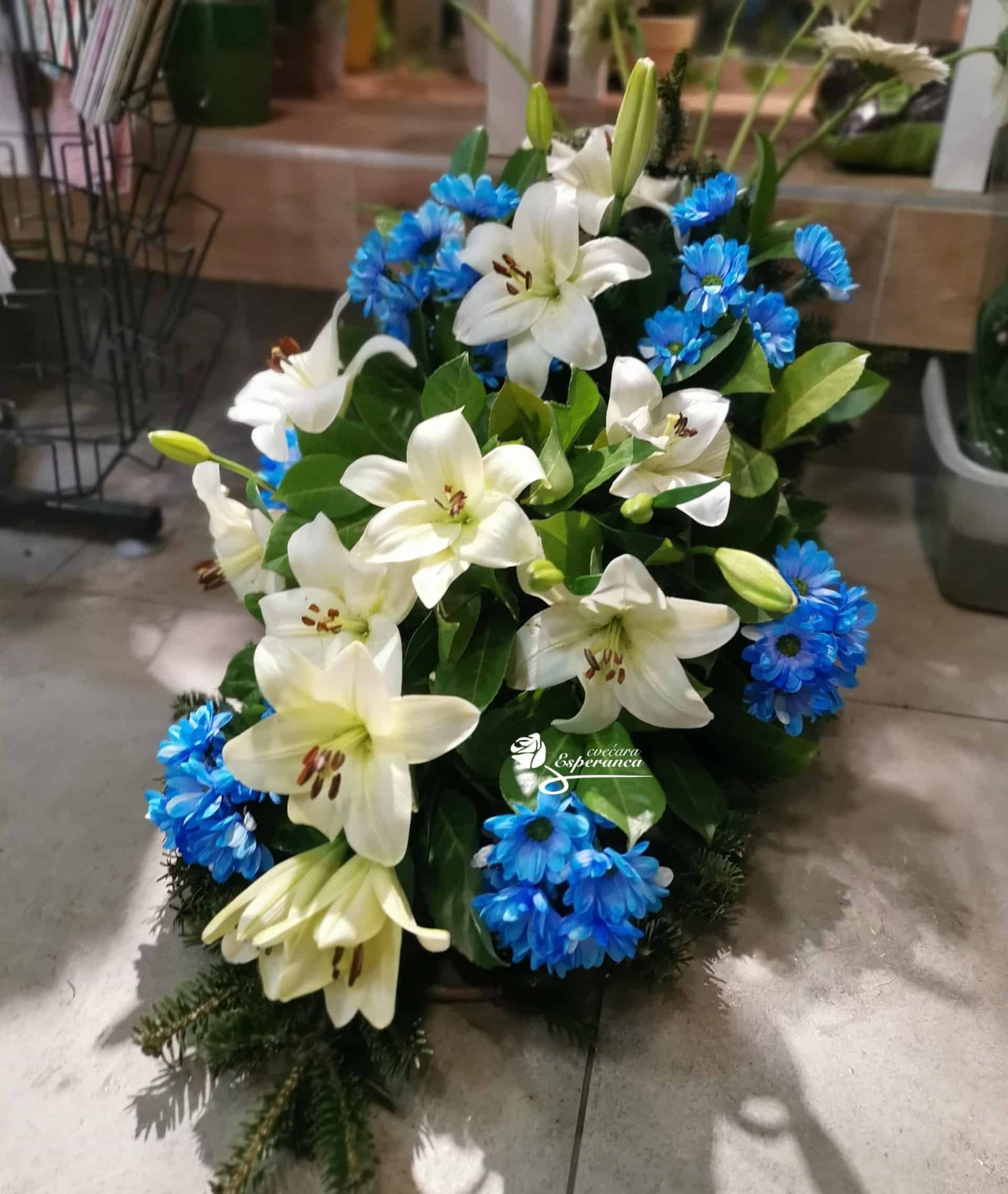 Suza za groblje-Izjavu saucesca. Napravljena od ljiljana i hrizantema.