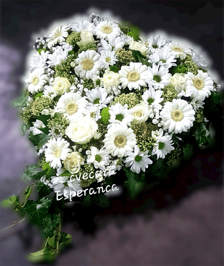 Srce o cveca. Izradjeno od gerbera,ruza,hrizantema,dekorativnog zelenila.