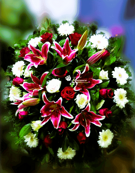 Venac od orjentalnog ljiljana,ruza,gerbera i zelenila.