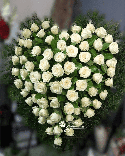 Srce od 70 belih ruža, nežnih i besprekorno čistih latica, formira spokojno i dostojanstveno venac, izražavajući duboku počast i ljubav prema osobi koja više nije s nama.